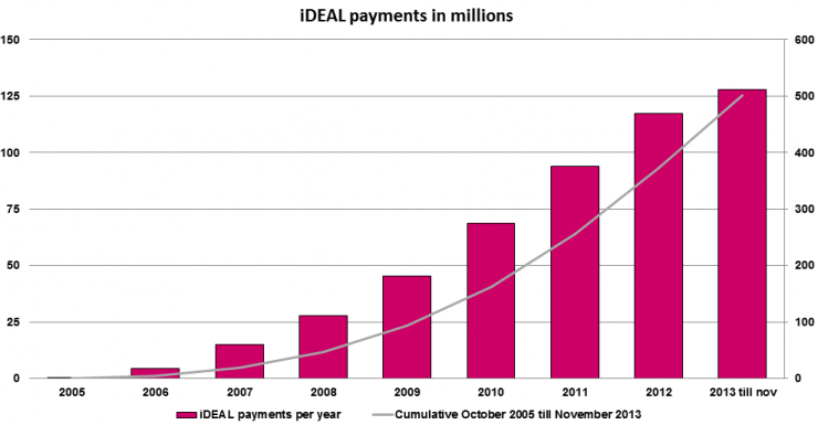 目前在荷兰占据大约50%+的市场份额,当地有80%在电商都支持iDEAL,下面是iDEAL交易增长图: